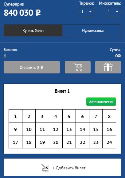 Как увеличить шансы на выигрыш Мультиставка — удобная покупка сразу нескольких случайных билетов. Вы можете сами выбрать количество билетов, тиражей и множитель. Числа подбираются автоматически. Множитель кратно увеличивает сумму выигрыша во всех категориях, кроме суперприза. Максимально — в 100 раз. Многотиражность позволяет одному билету участвовать в нескольких тиражах подряд. Их количество вы можете указать в мультиставке или после выбора чисел. Максимально — 50 тиражей.