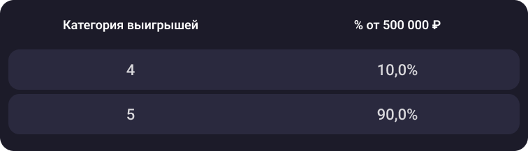 Как разыгрываются 500 000 ₽ в категориях выигрышей, смотрите в таблице.