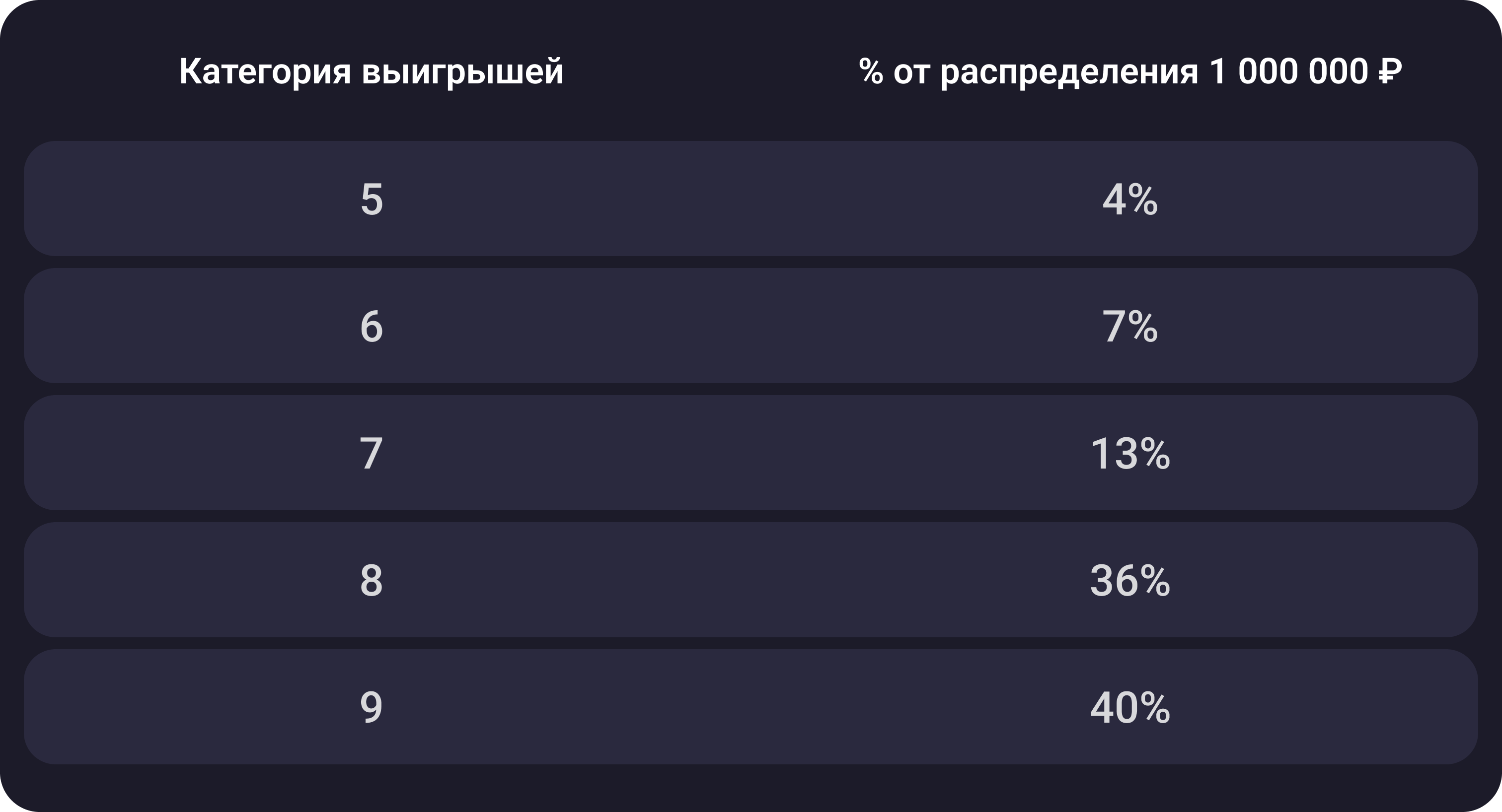 Подробнее о распределении по категориям выигрышей смотрите в таблице.