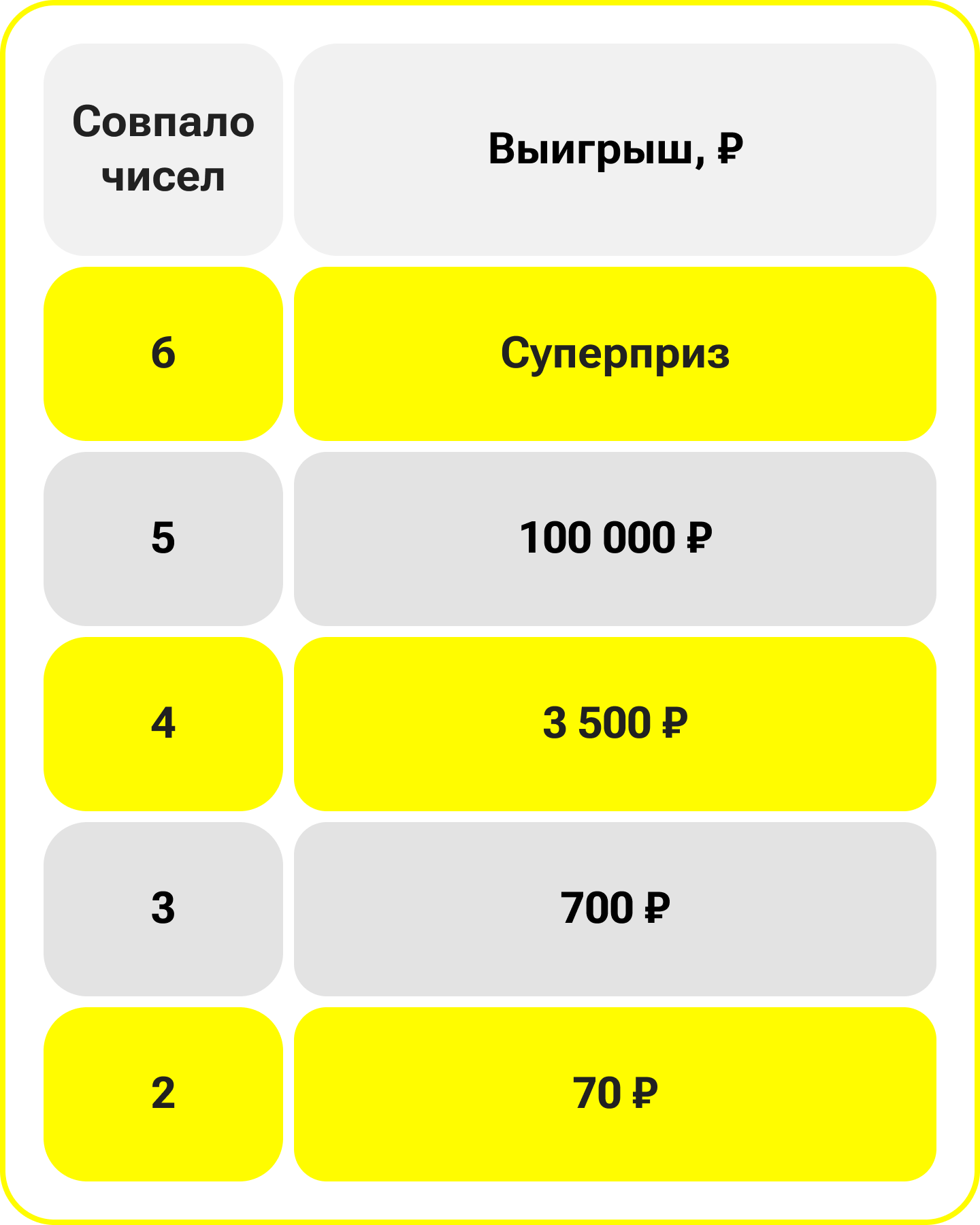 С 11:00 мск 20 октября в «Спортлото «6 из 45» меняется цена — теперь от 70 ₽. Попробуйте угадать 6 чисел и забрать суперприз от 15 000 000 ₽ по легендарной формуле «Спортлото»!