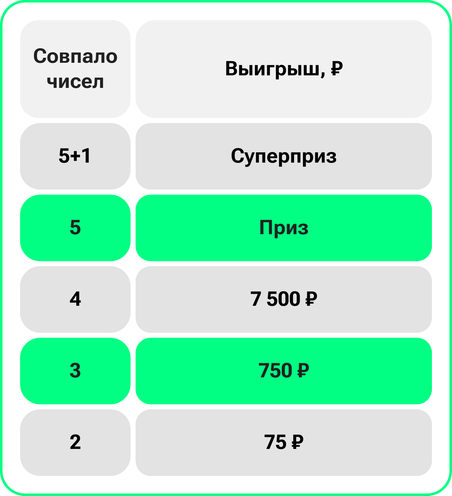 С 11:45 мск 20 октября в «Спортлото «5 из 36» изменилась цена — теперь от 75 ₽. В среднем в лотерее каждую неделю появляется новый миллионер. Покупайте билеты и ловите шансы на приз от 1 000 000 ₽ и суперприз от 3 000 000 ₽.