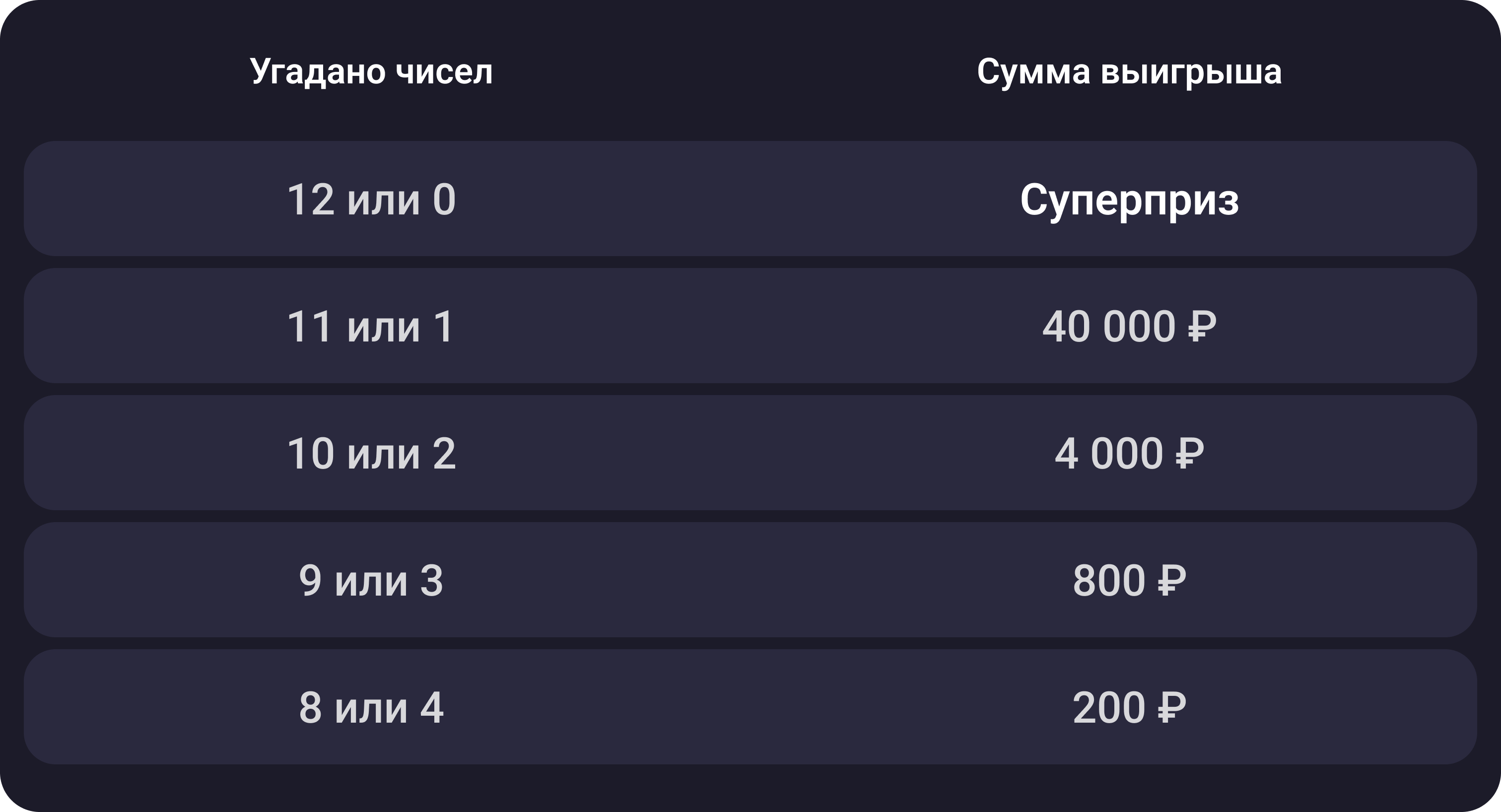 С 12 ноября цена билета в лотерее «Всё или ничего» будет от 200 ₽. Гарантированный суперприз по-прежнему от 10 000 000 ₽. Выиграйте его, угадав 12 чисел или ни одного!