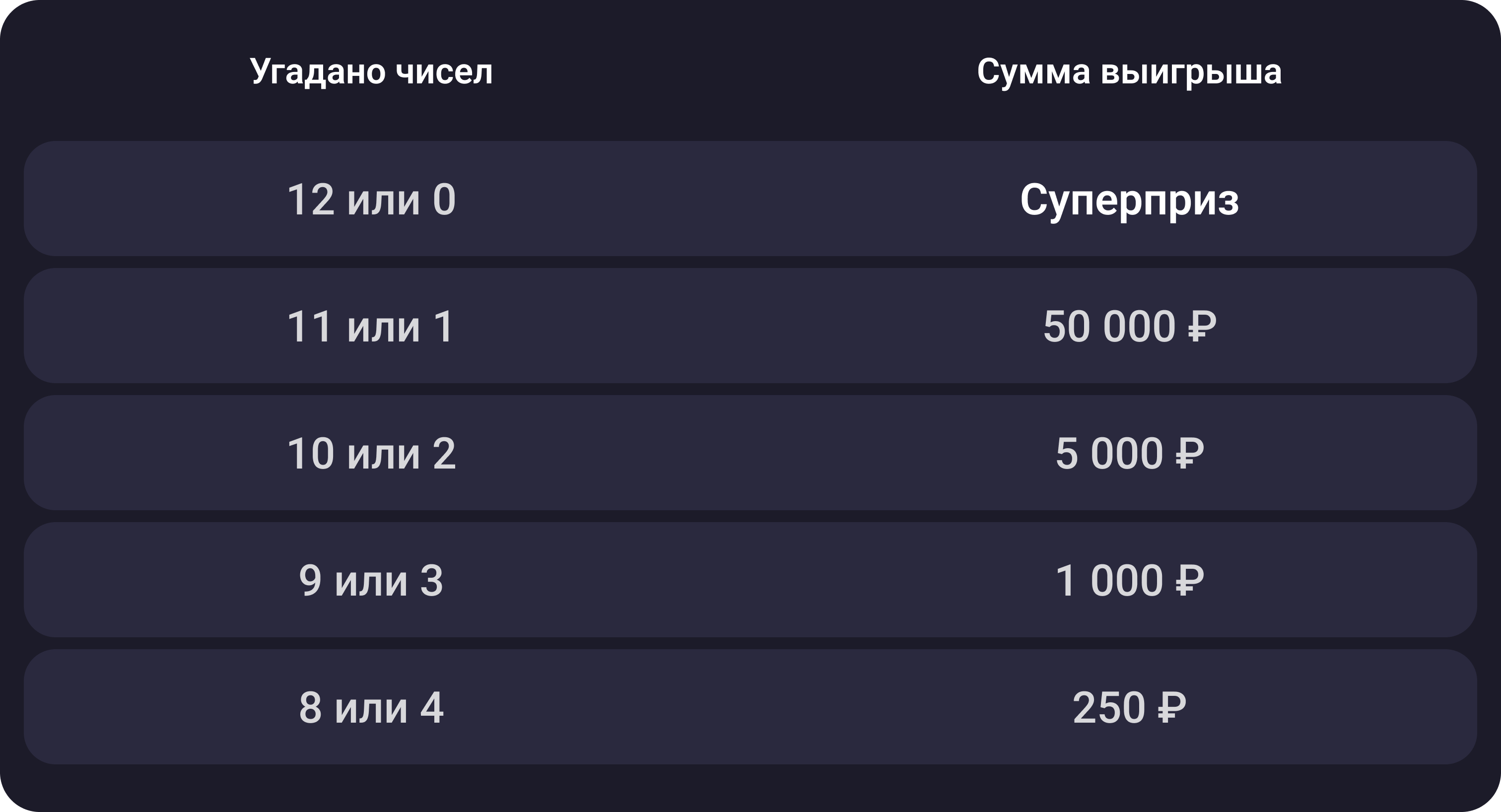 С 12:45 мск 14 ноября меняется цена билета во «Всё или ничего». Купить можно будет от 250 ₽. Суперприз от 10 000 000 ₽. Угадайте 12 чисел или ни одного — и он ваш!