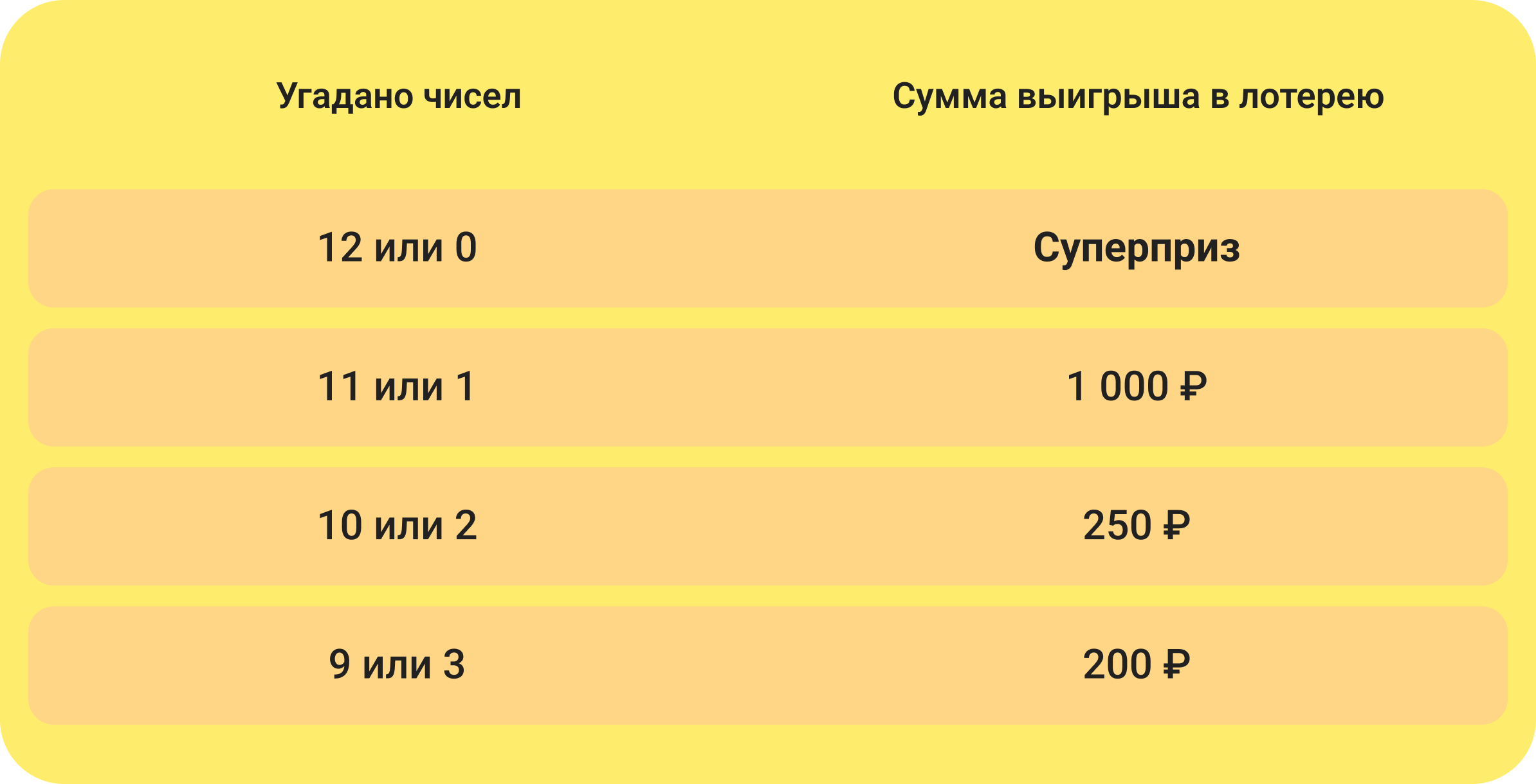 С 17 ноября в лотерее «Остатки сладки» минимальные выигрыши в 10 раз больше — от 200 ₽. Первый тираж в 10:45 мск. Акция действует до 10:15 мск 24 ноября включительно. Успейте забрать себе лучший кусочек!
