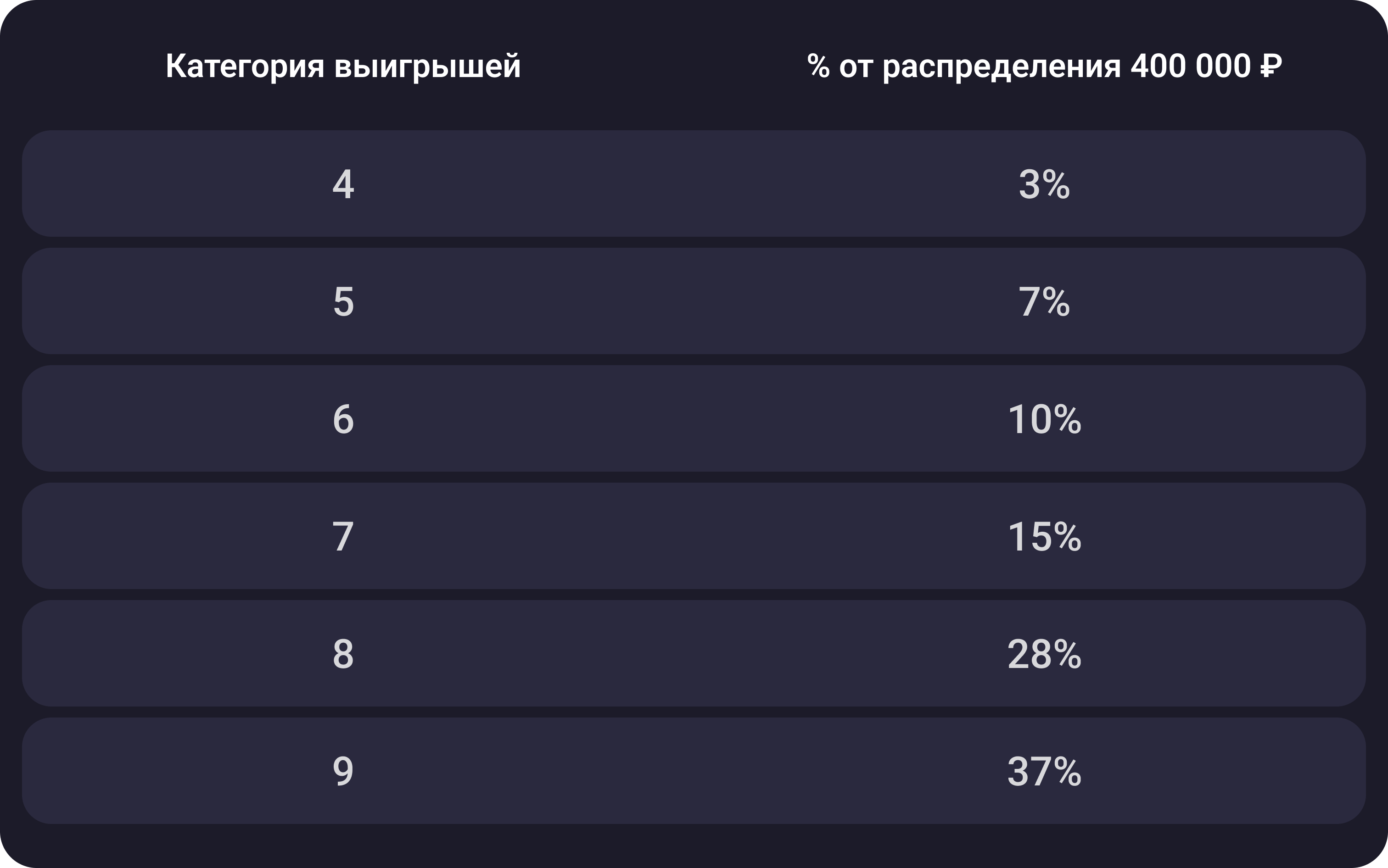 Подробнее о распределении 400 000 ₽ по категориям выигрышей смотрите в таблице.