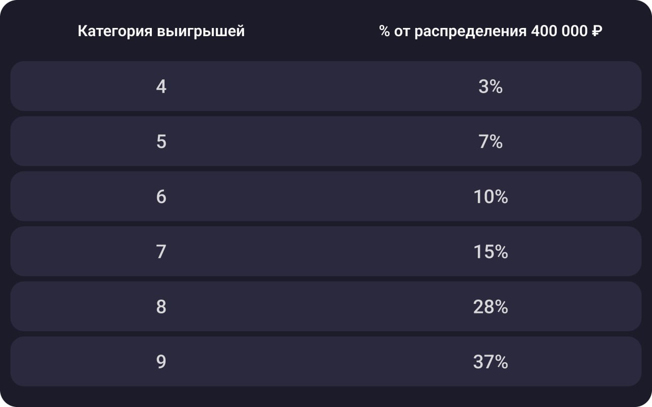 Подробнее о распределении по категориям выигрышей смотрите в таблице: