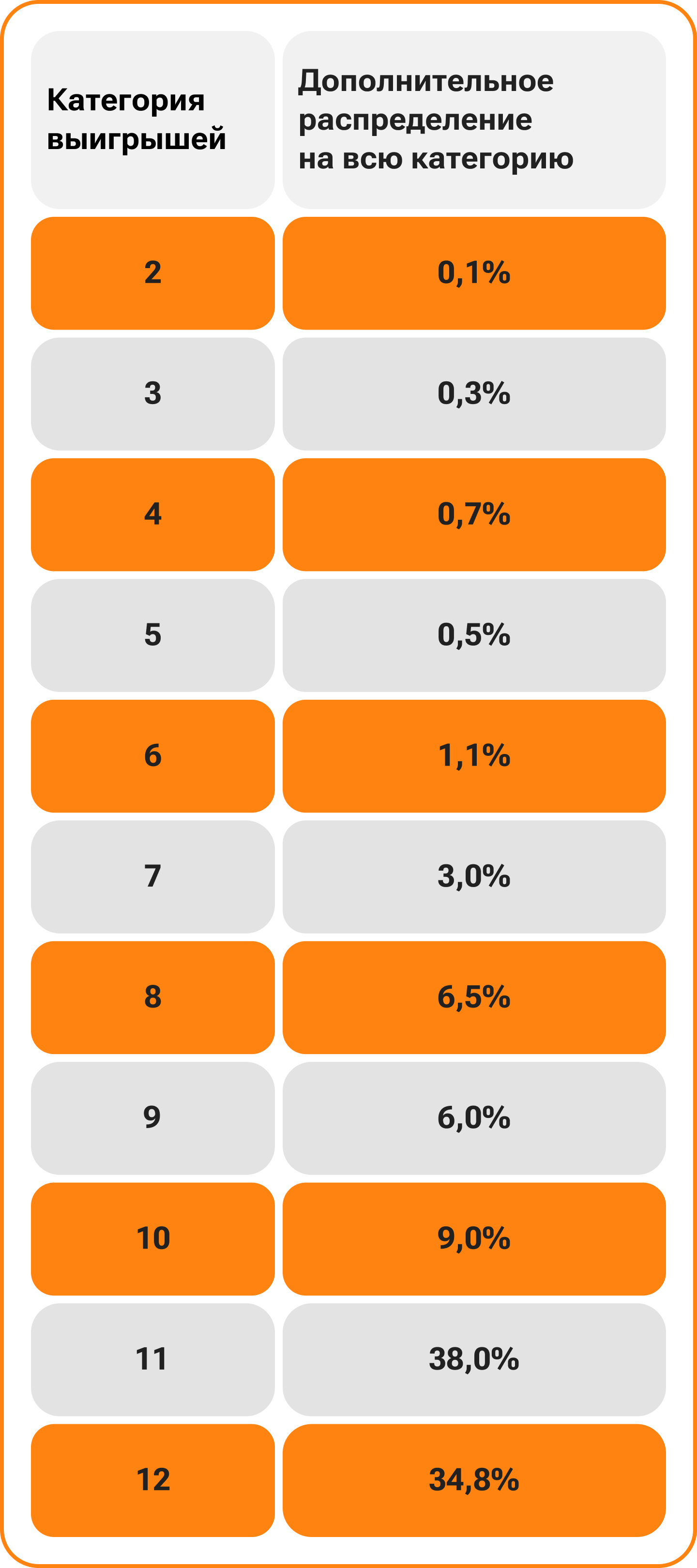 Подробнее о распределении по категориям выигрышей смотрите в таблице.