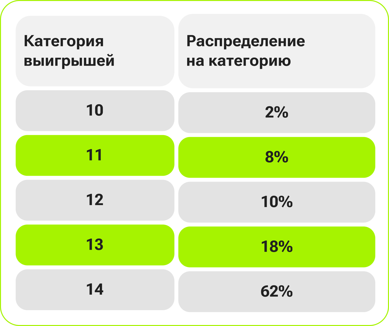 Подробнее о распределении по категориям выигрышей смотрите в таблице.