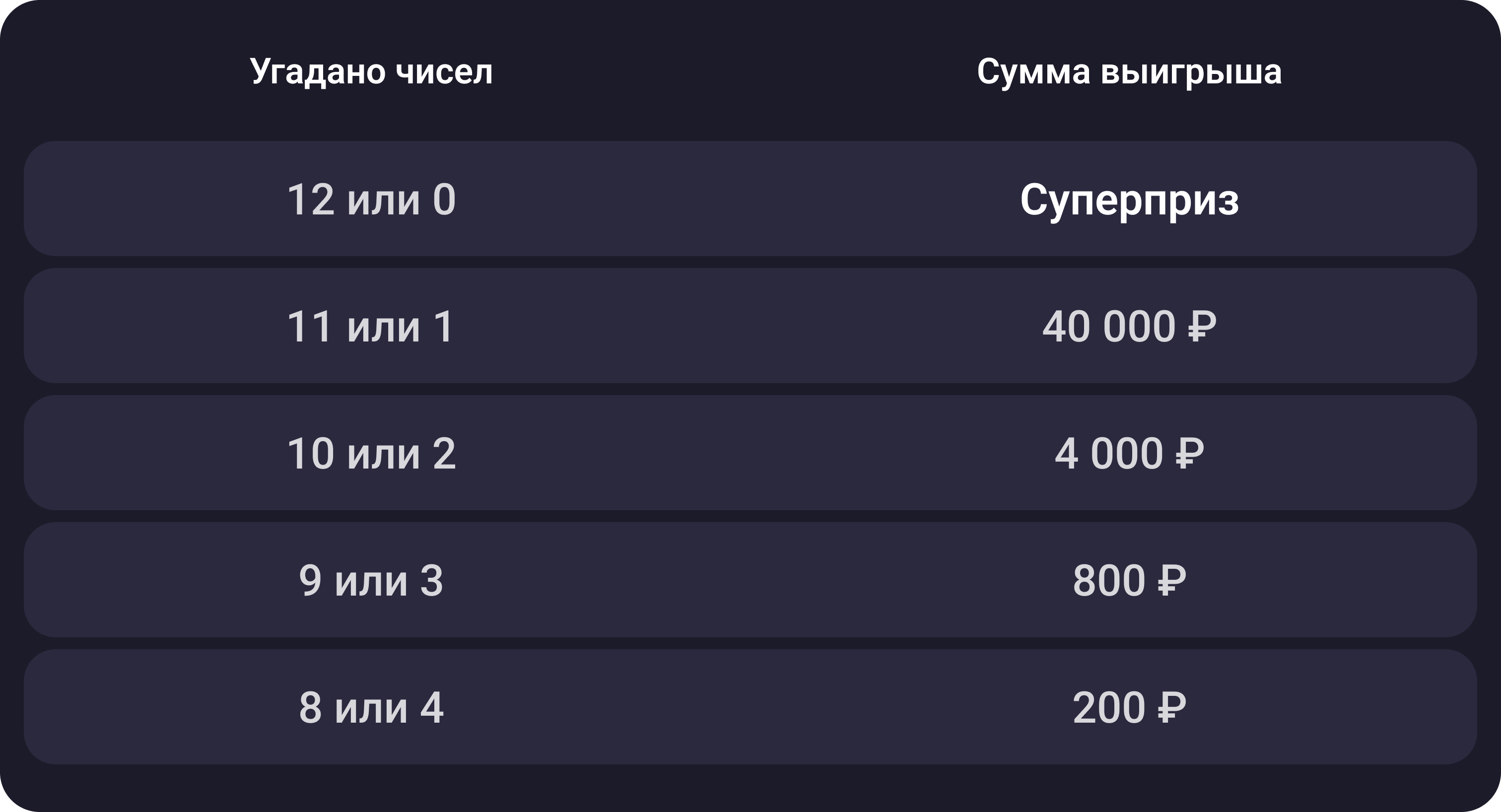 С 00:00 мск 11 февраля изменится цена билета во «Всё или ничего» — играйте от 200 ₽. Победителя ждёт суперприз от 5 000 000 ₽. Угадайте 12 чисел или ни одного — и он ваш!