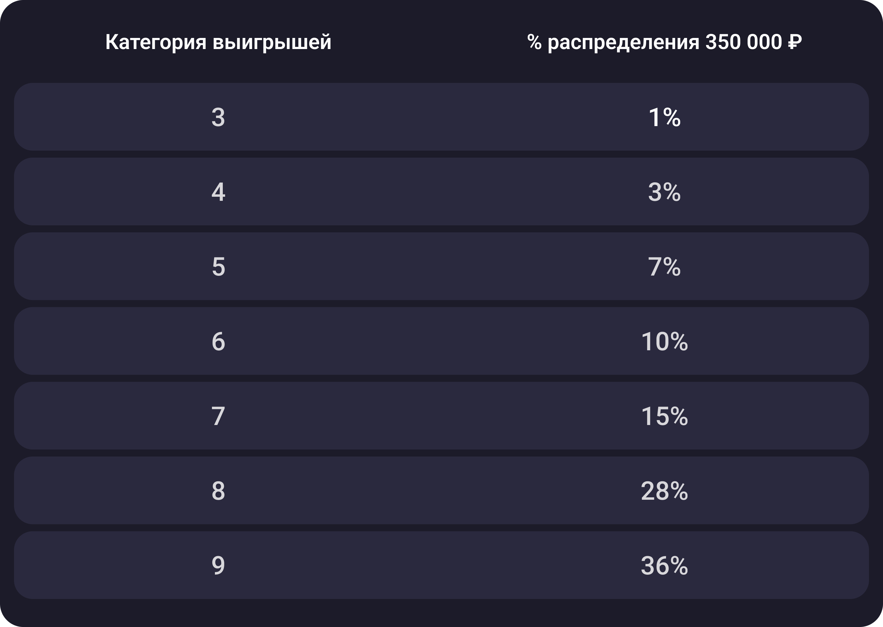 Подробнее о распределении по категориям выигрышей смотрите в таблице.