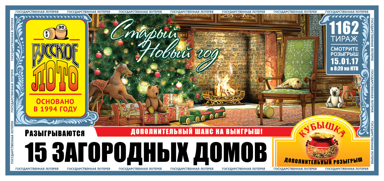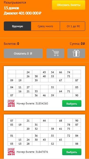 В билете «Русского лото» два игровых поля, в каждом — по 15 чисел в диапазоне от 1 до 90. Комбинации чисел в билетах уже сформированы, поэтому вам просто нужно выбрать понравившийся билет.